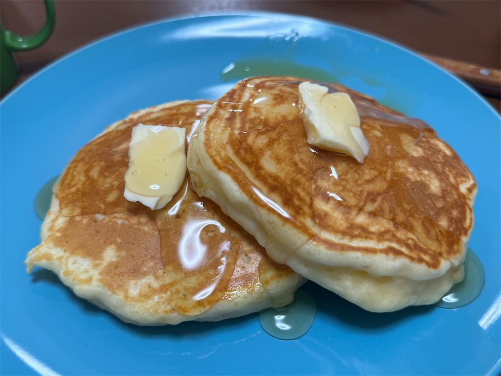 自宅に戻ると妻と息子の朝食がホットケーキ